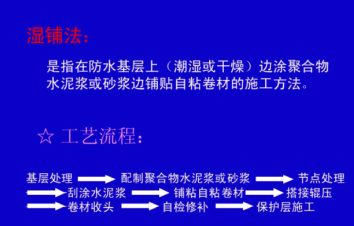 采用聚合物水泥浆(或砂浆)做粘结剂,铺贴自粘卷材的工法。(聚合物可为108胶水,用量是水泥用量的3—5%)