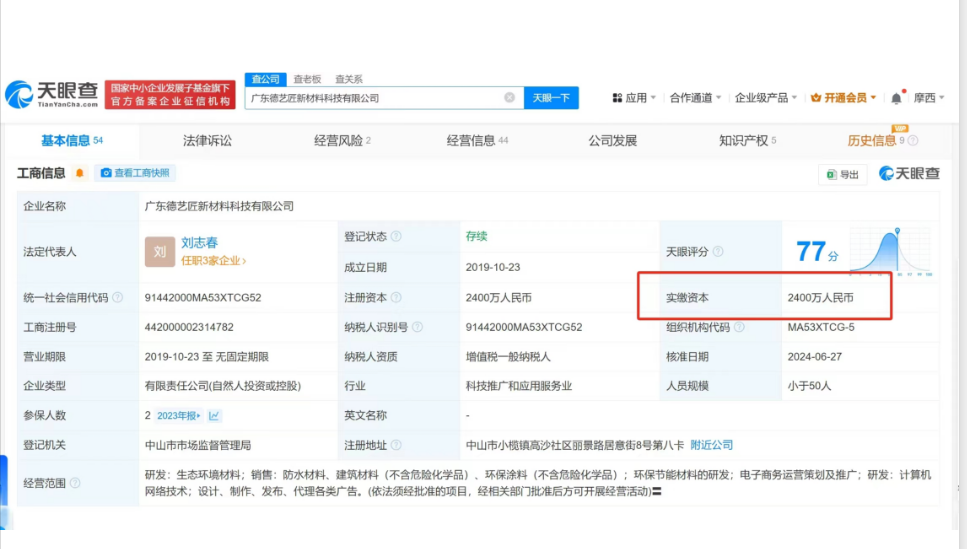 恭喜“广东德艺匠新材料科技有限公司”注册资本2400万,正式完成实缴,再一次证明实力!